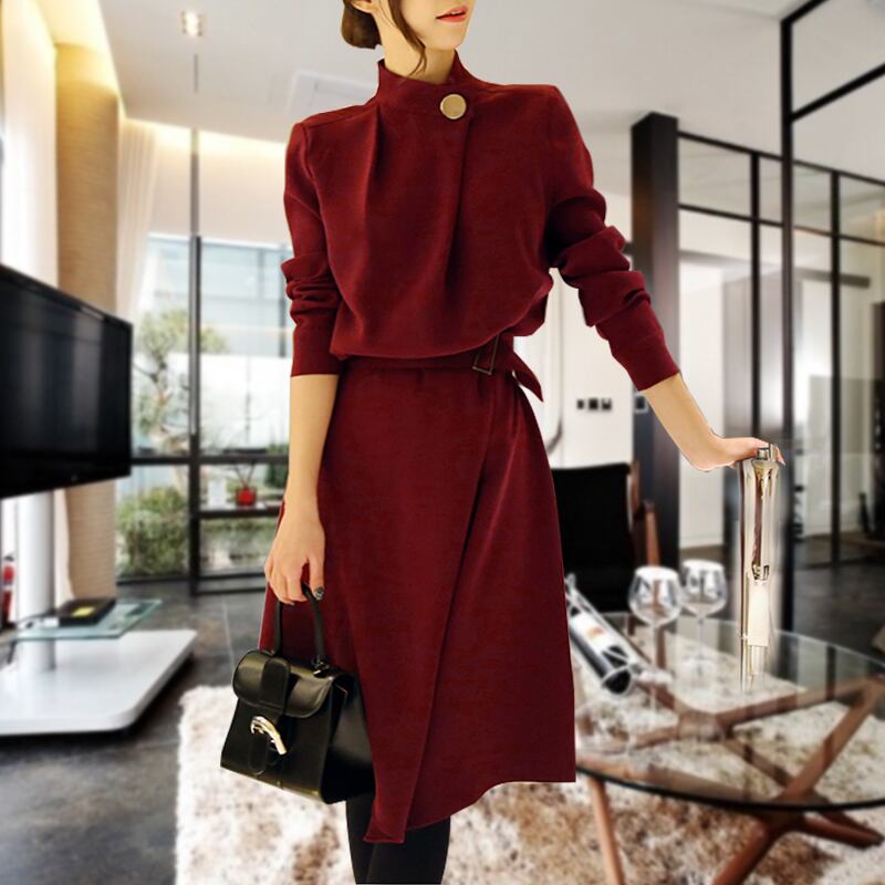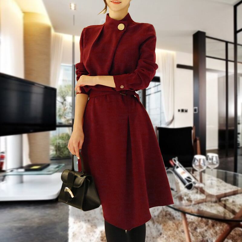 ドレープスタイルのスリット入りフレアスカートラインで、