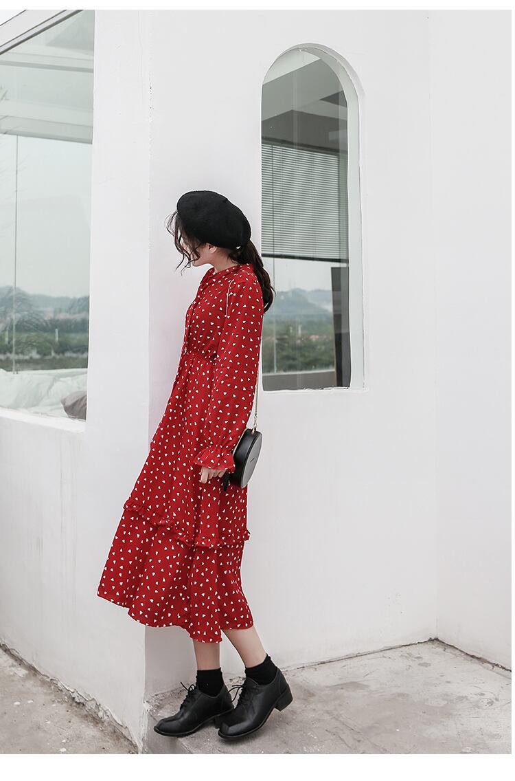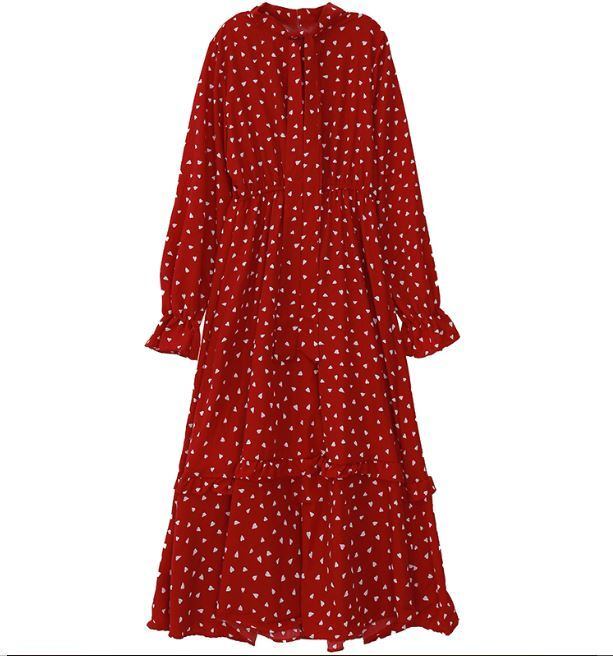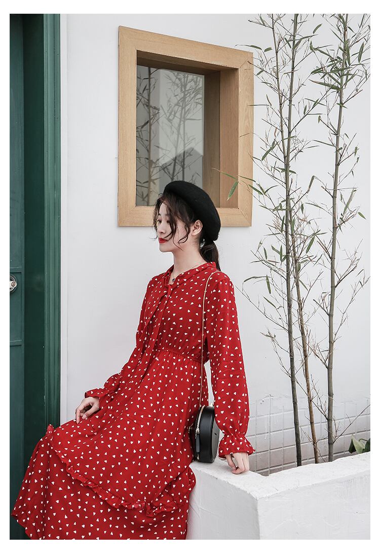 NEW 人気 売れ筋 ロングワンピース ミモレ丈 膝下丈 リボンタイ ボウタイ 袖フリル ハイウェスト ウエストゴム フェミニン ガーリー ハート柄 KN-0212 | dress_sugar_moon