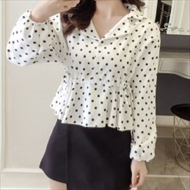 小さめのドット柄がトレンドライクな長袖ブラウスのご紹介です。