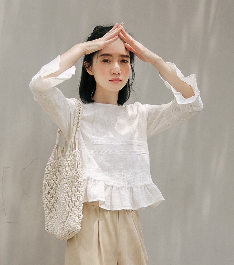 程よいフリル感が甘くなりすぎないナチュラルブラウスのご紹介です。