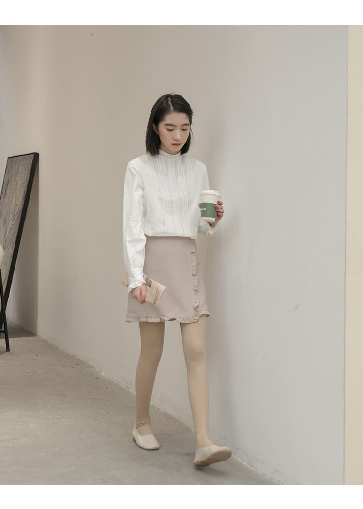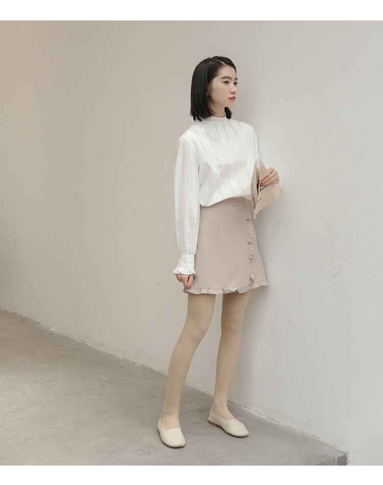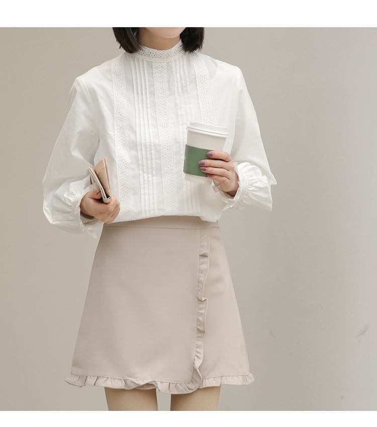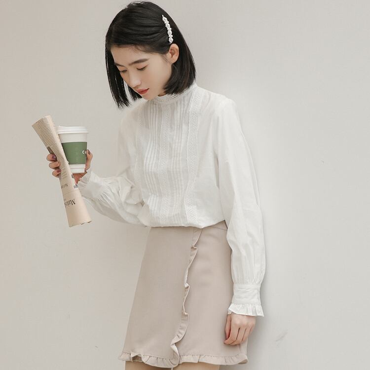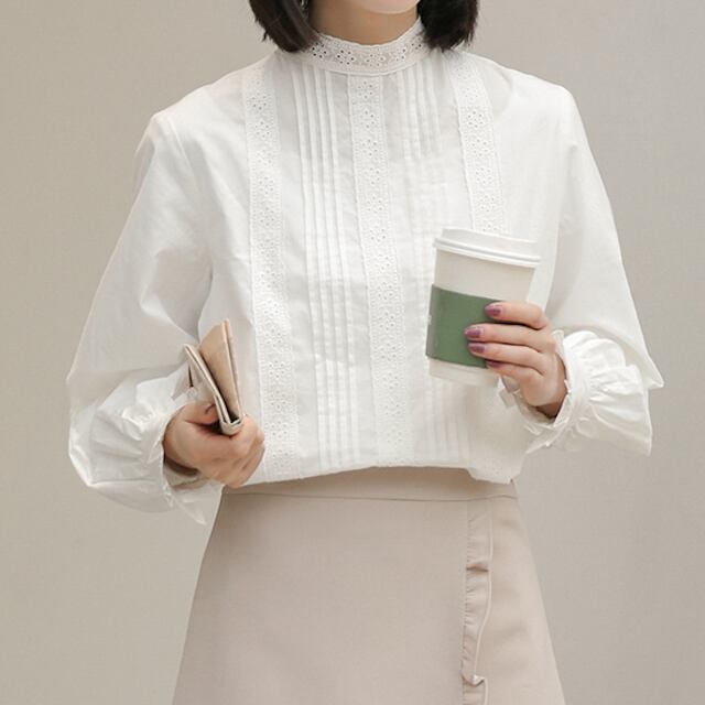 シンプルなレースやフリルが清楚で女性らしい雰囲気の長袖スタンドカラーブラウスです。