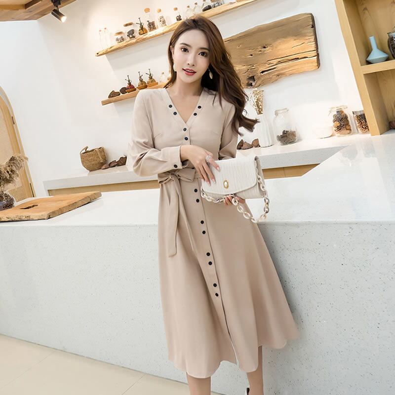 やや深めのVネックと上品なミモレ丈で、