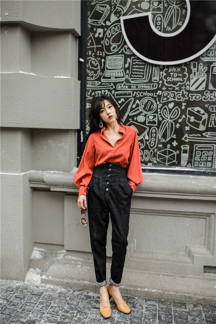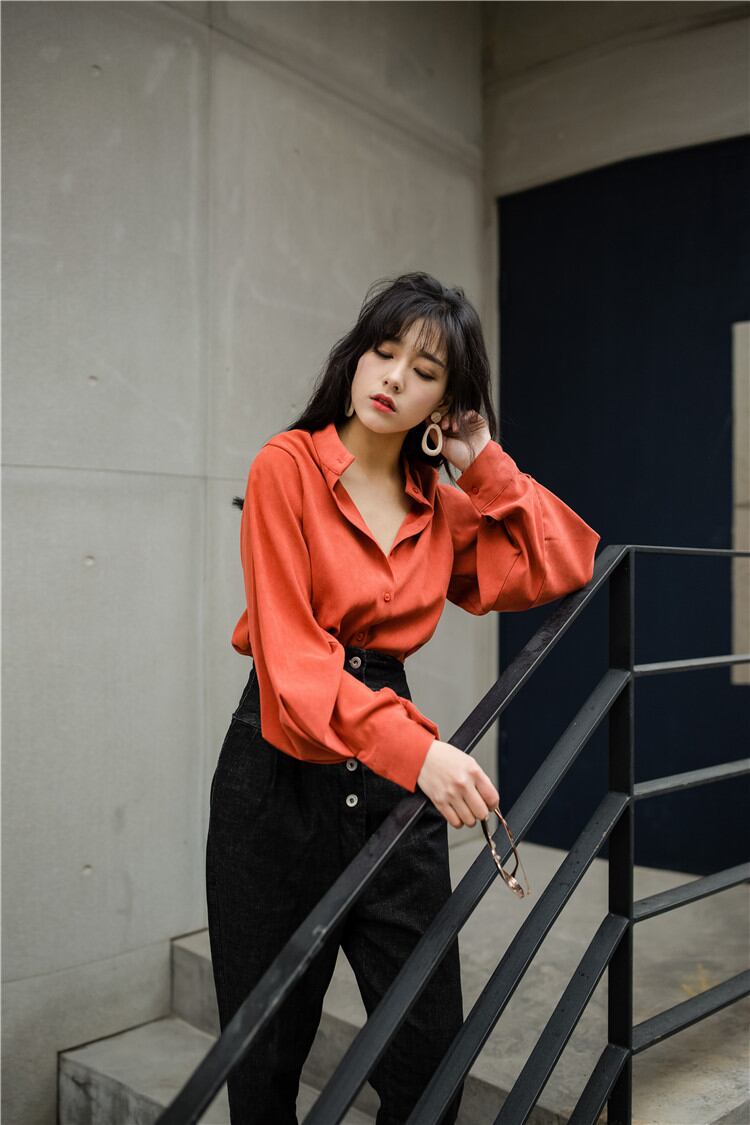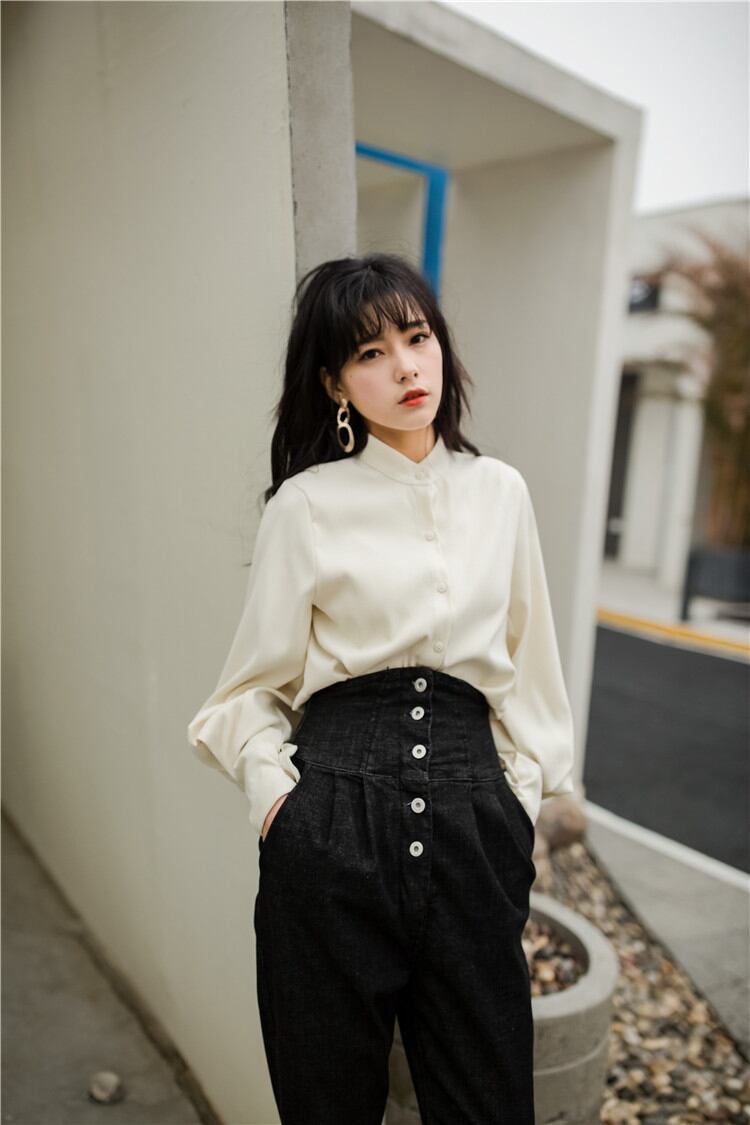 オススメ 人気 春 ブラウス 長袖シャツ パフスリーブ ランタンスリーブ バンドカラー スタンドカラー ゆったり フェミニン カジュアル 上品 クール KN-0176 | dress_sugar_moon