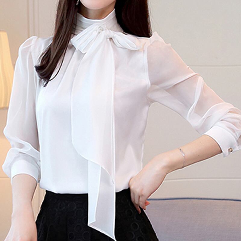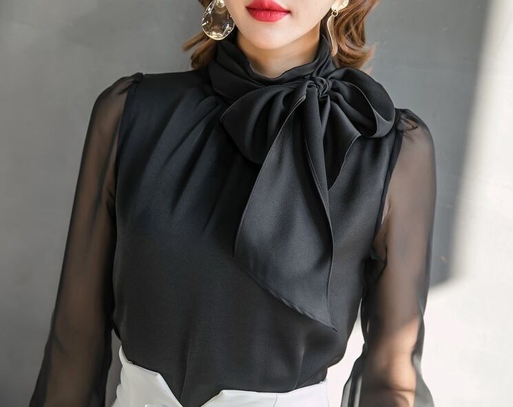 ネック部分にあしらった大きめリボンがエレガントさ惹き立てるシフォンブラウスです♪