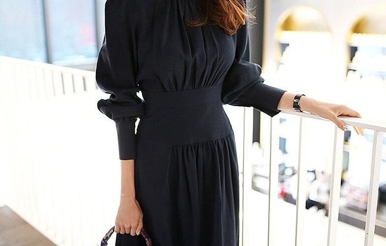 落ち着いたネイビーカラーで上品な着こなしへとアシストするミモレ丈ワンピースです♪