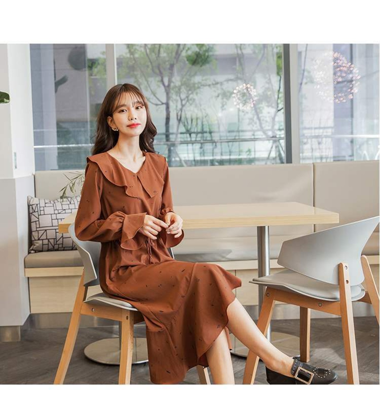 胸元やスカートの大きめフリルが可愛いミモレ丈ワンピースです。