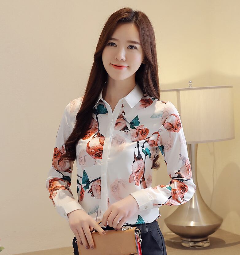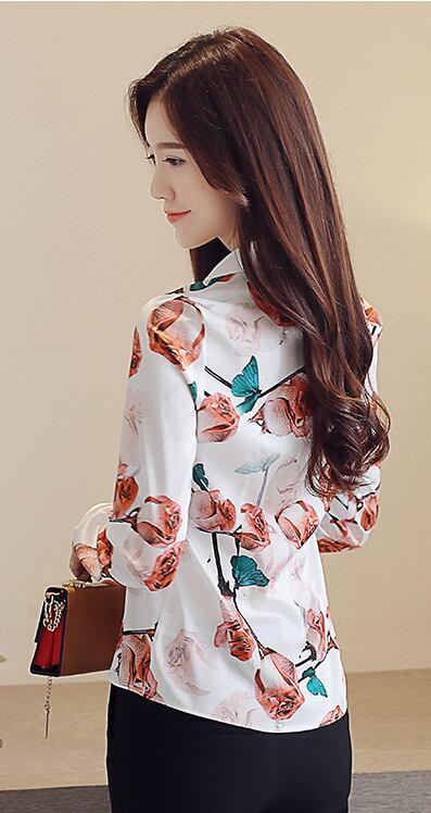 全体に施された大きな花柄が印象的で、大人っぽく女性らしい雰囲気の長袖シフォンシャツです。