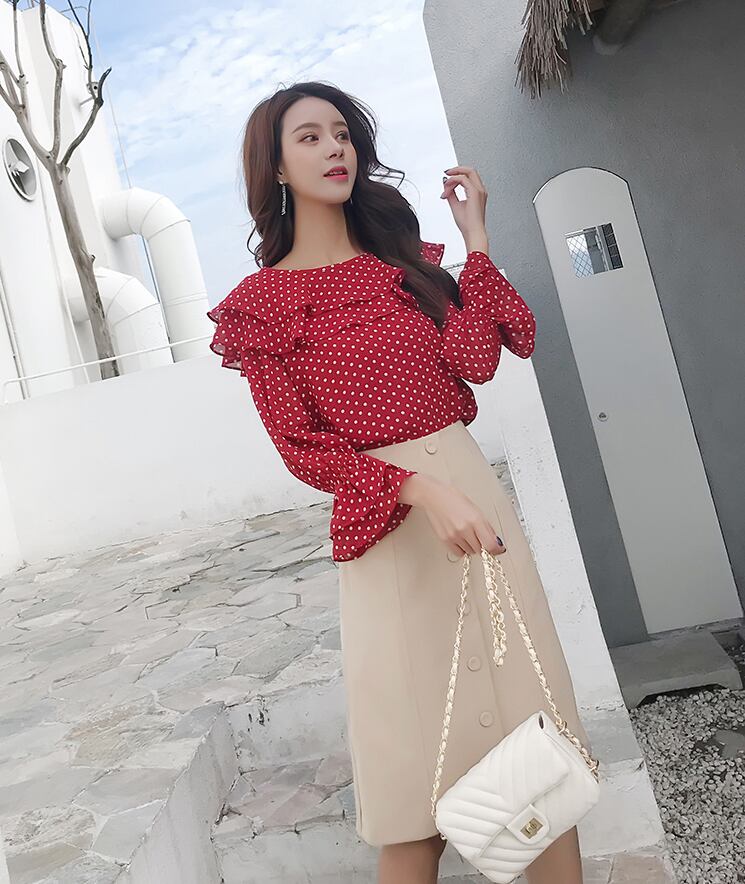 大人っぽく女性らしい雰囲気のドット柄長袖ブラウスと