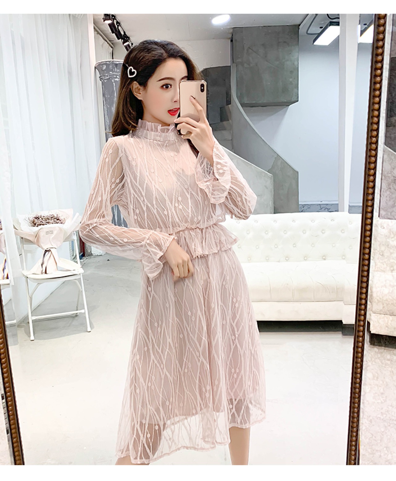 春物 今季トレンド ワンピース 長袖ワンピース 膝丈 フレアスカート レース スタンドカラー エレガント フェミニン きれいめ ガーリー パーティ 結婚式 KN-0329 | dress_sugar_moon