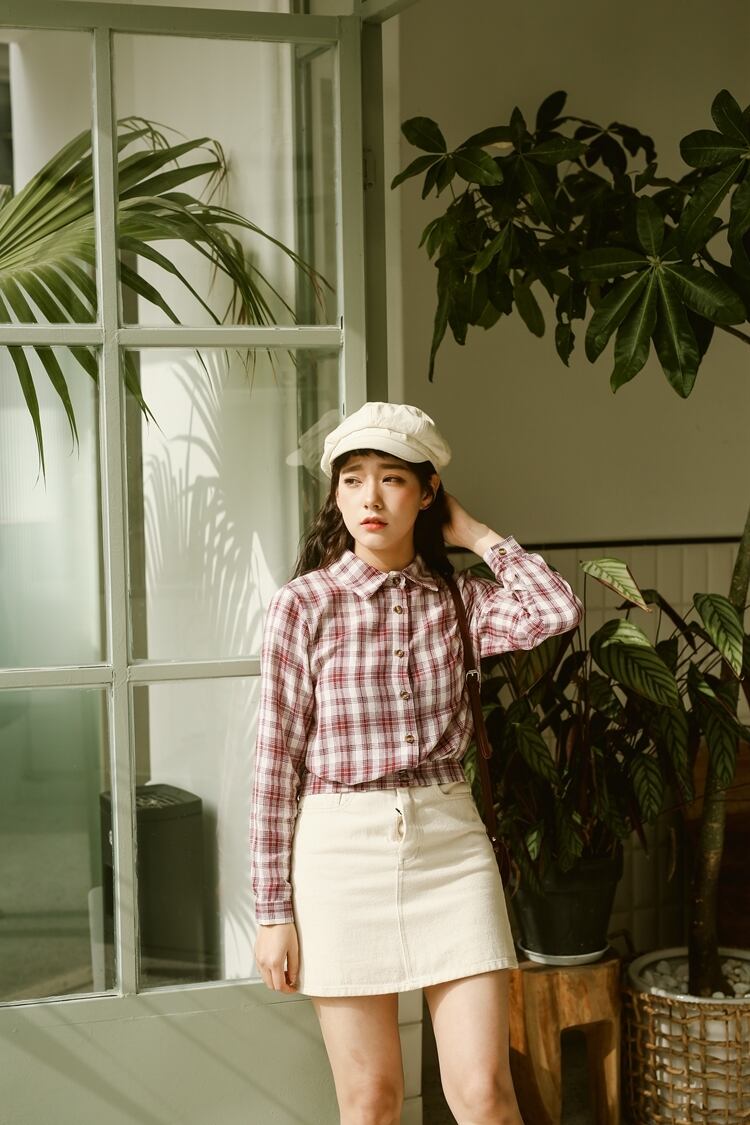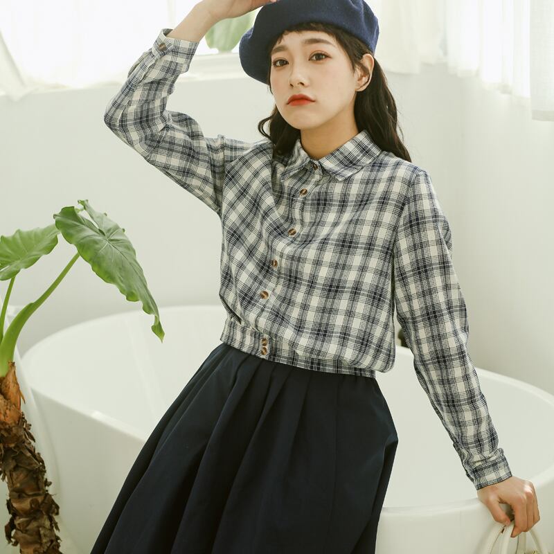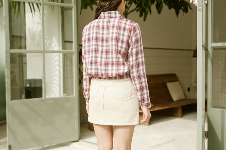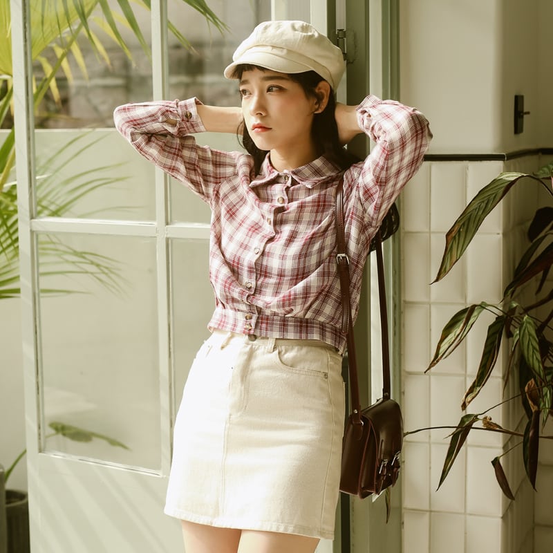ちょっぴり短めの着丈で女性らしさを惹き立てる長袖チェック柄ブラウス。