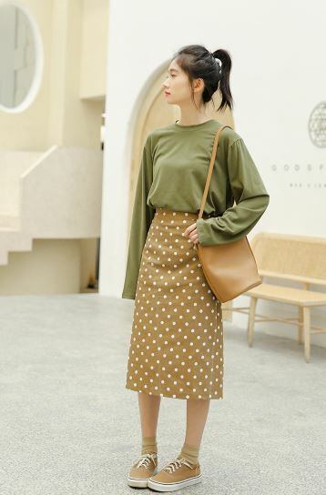 トレンドのドット柄が目を惹くペンシルスカートです。