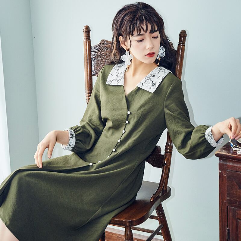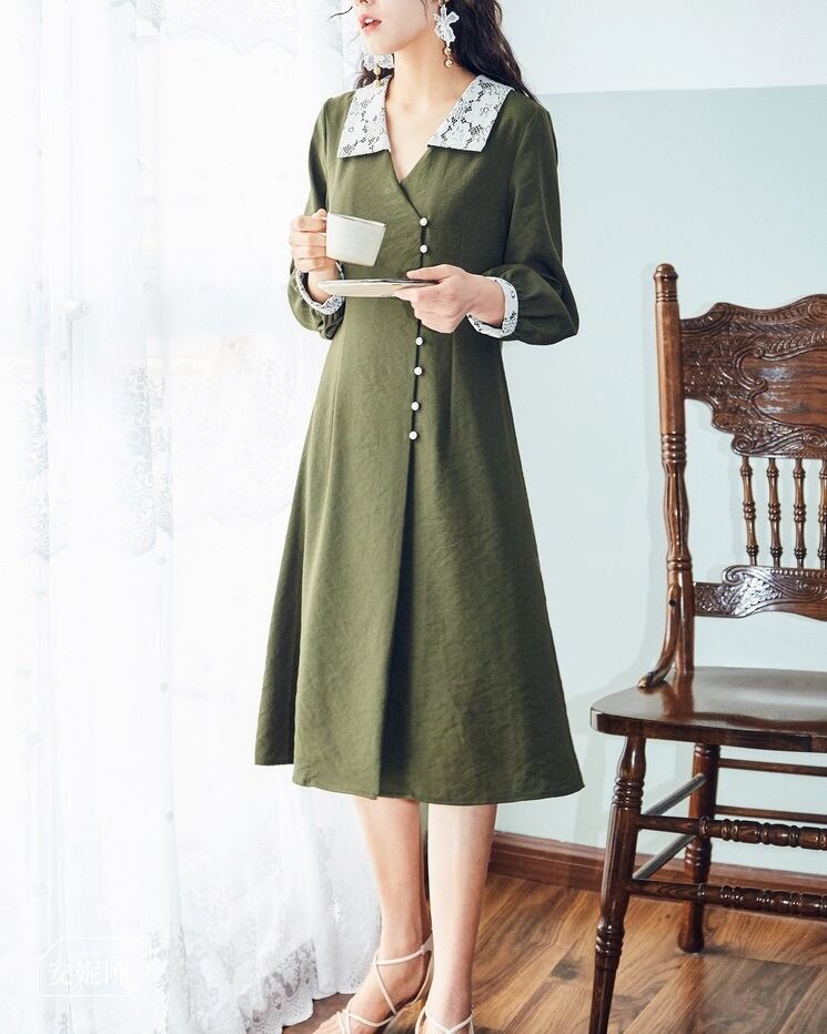 シックなグリーンカラーに映えるホワイトレースがロマンティックな可愛らしさを演出してくれます。