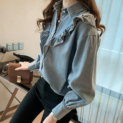フリルとパールで女性らしいデザインのデニムシャツです。