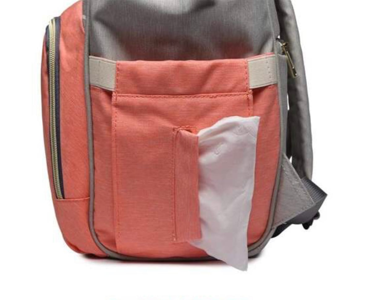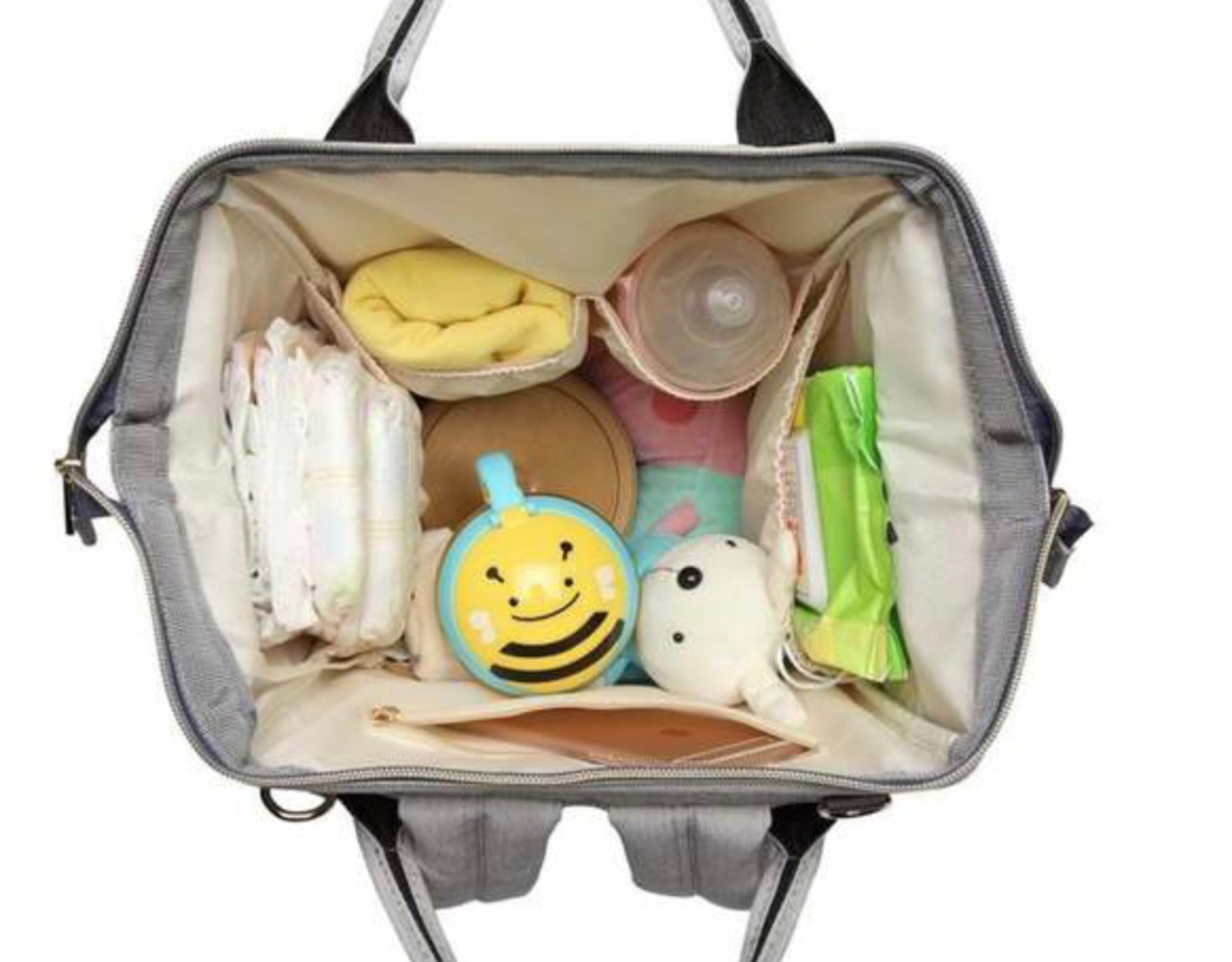 正面のチャックを開けるとアルミポケットで飲み物の温度、ミルク、哺乳瓶などを持ち運べます‼
