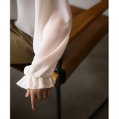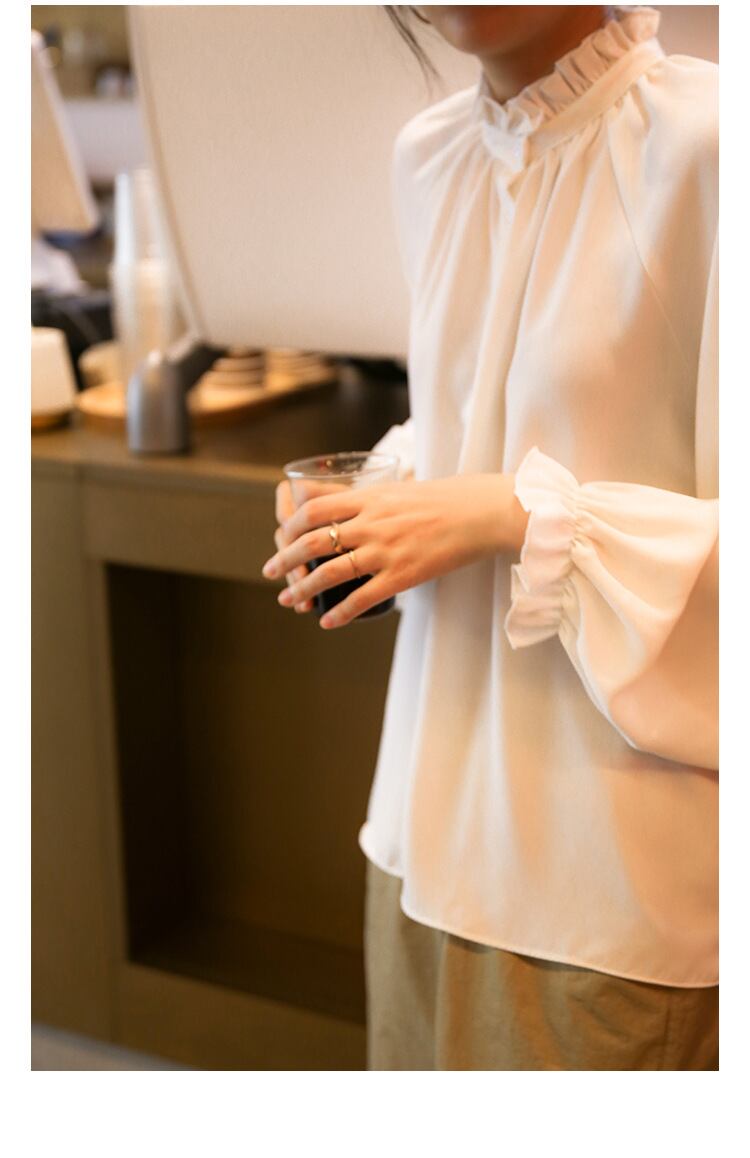 ハイネックの襟部分、袖部分には女性らしいフリル付き。