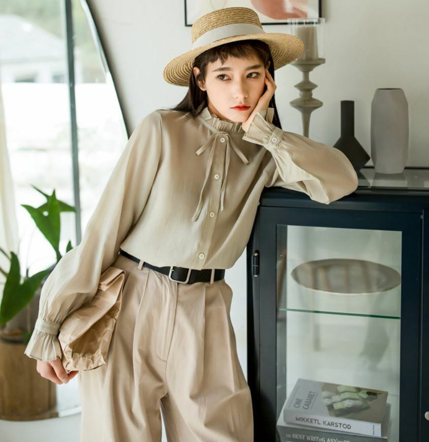 さりげないフリル使いと胸元のリボンがガーリーなハイネックブラウス☆