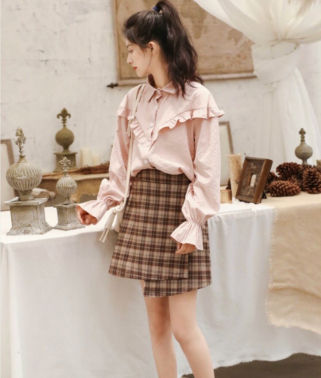 柔らかいカラーが春らしく可愛らしい雰囲気の長袖フリルブラウスです。