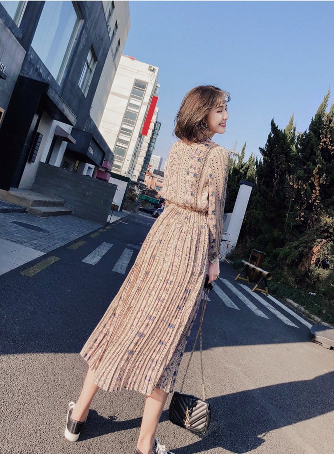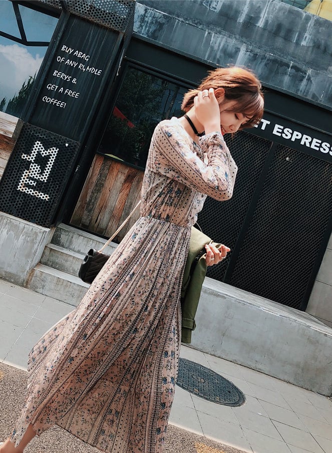 エレガントで落ち着いた雰囲気の膝下丈シフォンワンピースです。