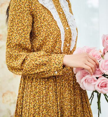 春色カラーが爽やかで、小花柄やレースが可愛らしい雰囲気の膝下丈ワンピースです。