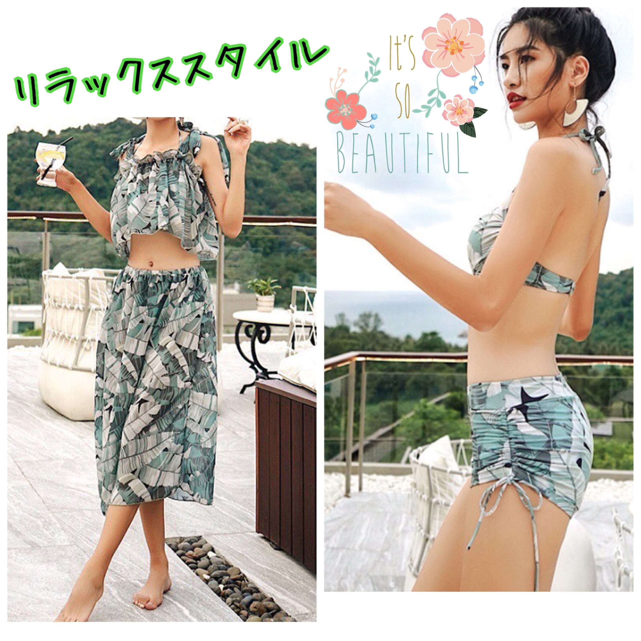大人リゾートスタイルにぴったりのプリントをシックな色合いでまとめたスイムウェア4点set♪