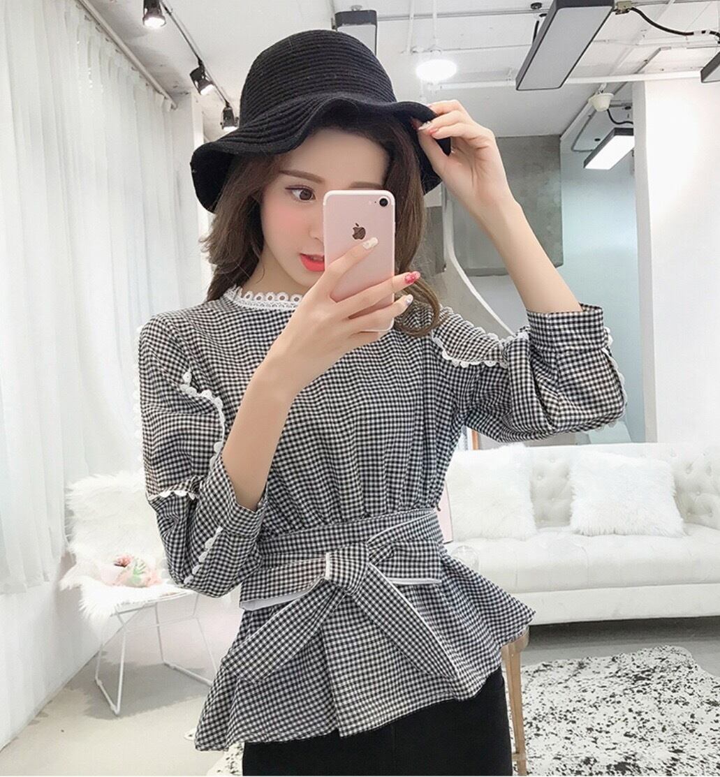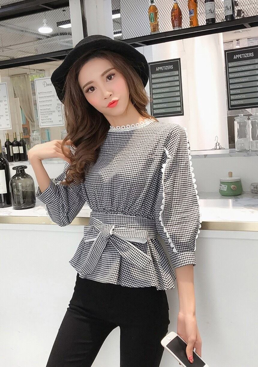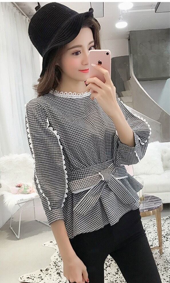カジュアルな雰囲気ながらもリボンやレースが女性らしくかわいい七分袖シャツです。