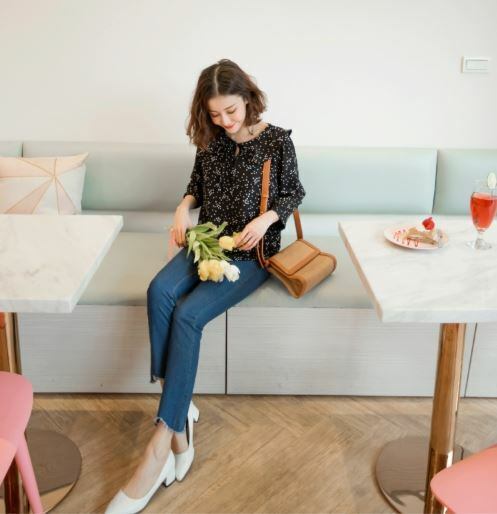 やわらかなシフォン生地に散りばめられた無造作なドット柄がリラックス感漂う七分袖ブラウスです。