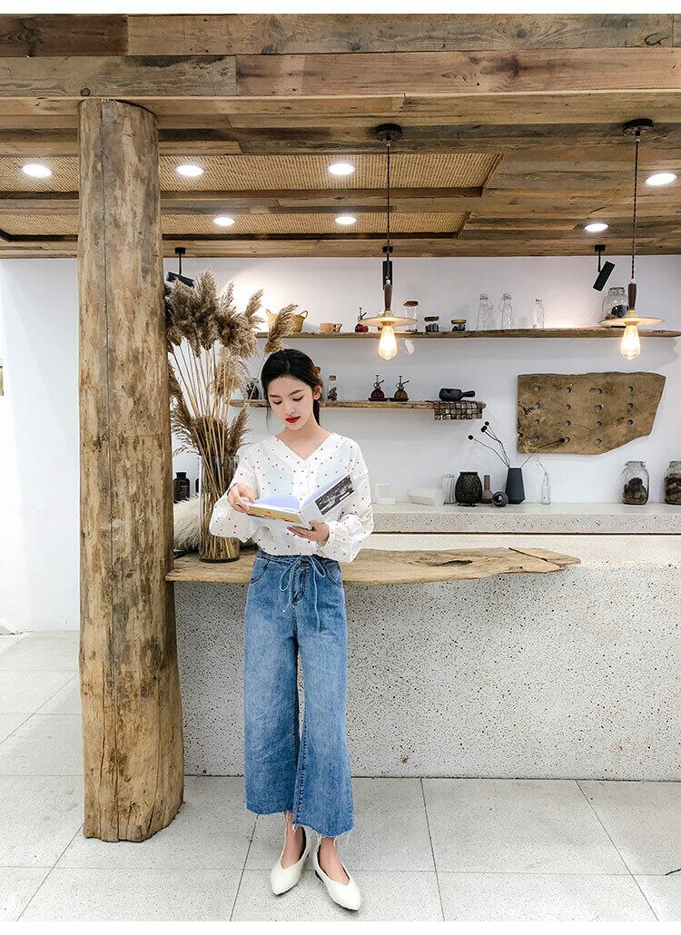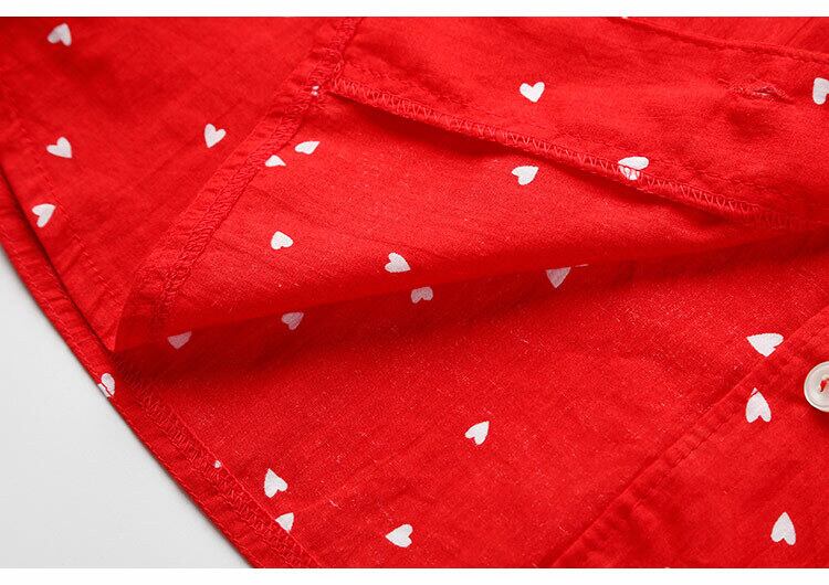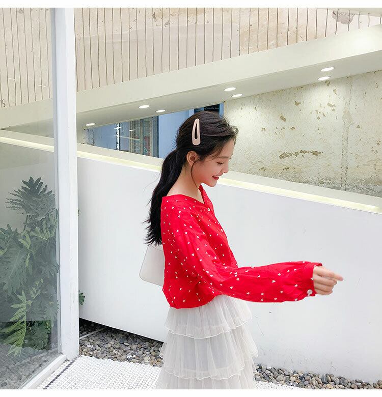 小さめのハート柄がカジュアルテイストなノーカラーシャツです。