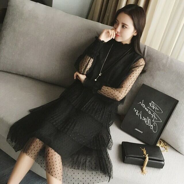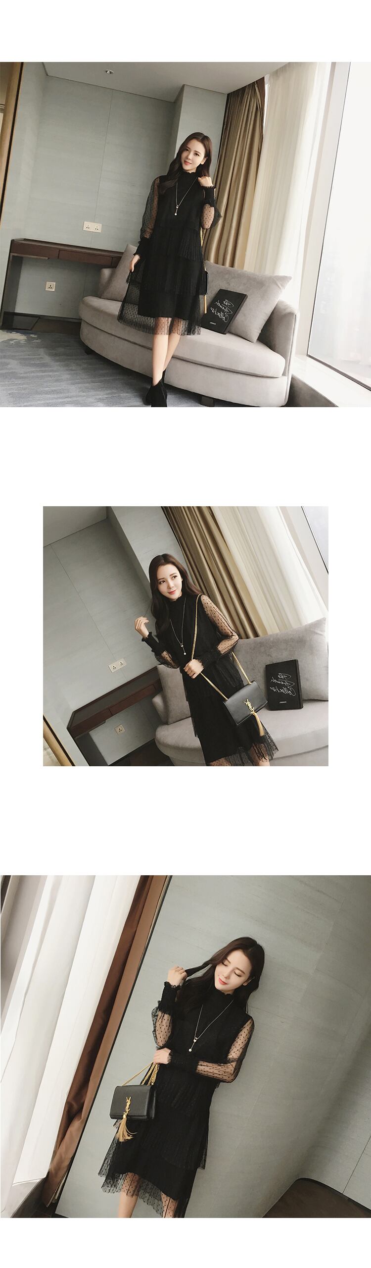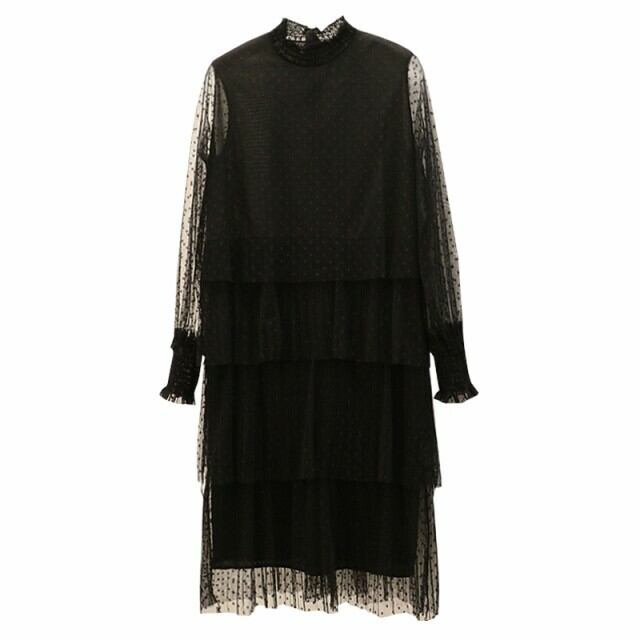 ワンピース 結婚式 大きいサイズ 二次会 ドレス お呼ばれ パーティー 謝恩会 冬 40代 30代 20代 50代 シースルー ドット 長袖 セーター フォーマル フリル ミモレ丈 ロング<br>ao-13511<br> | dress_sugar_moon