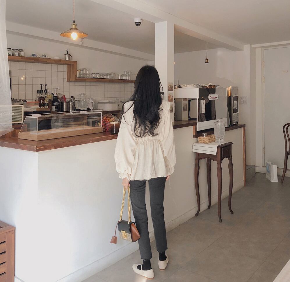 タイトなボトムスと合わせると、トップスのボリューム感が引き立つコーデに仕上がります。