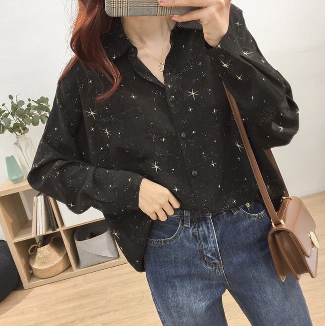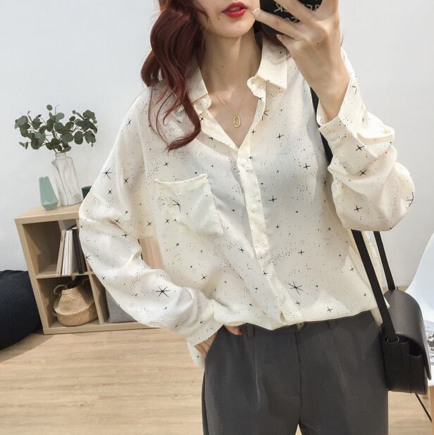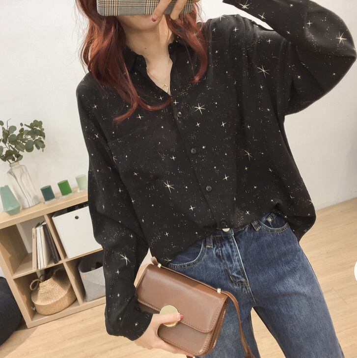 モノトーンで落ち着いた雰囲気ながらも、散りばめられた星柄がアクセントになっている長袖シフォンシャツです。