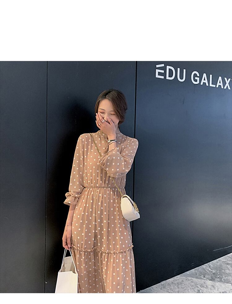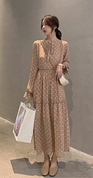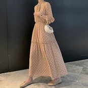やわらかなシフォン生地にピンクオレンジ×ホワイトのドット柄がフェミニンなロングワンピースです。