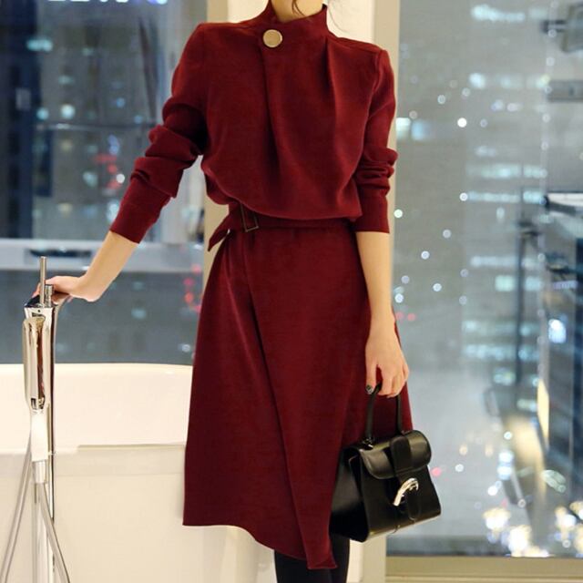 程よいアクセントのスタンドネックとウエスト部分の共布ベルトがより一層レディライクな装いへとアシスト!