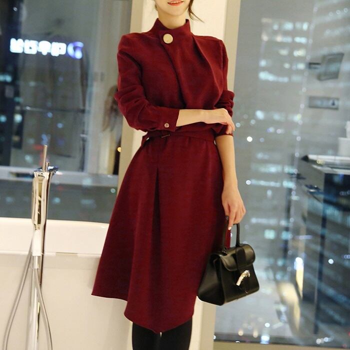 襟元の大きめボタンがレトロな印象のひざ丈フレアワンピースです。
