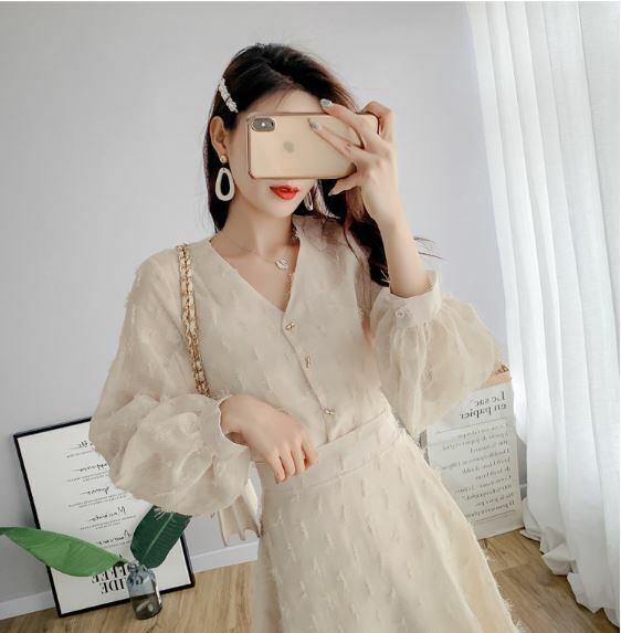 スッキリとしたVネックのトップスに膝丈スカートがきちんと感のある印象に☆