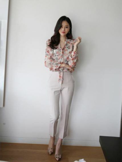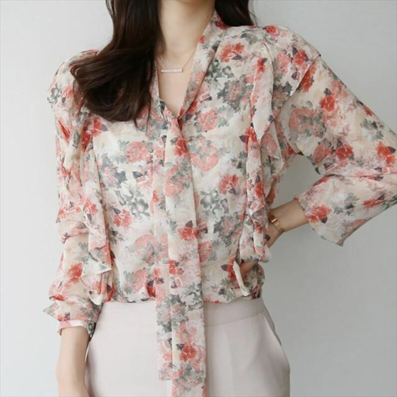 ほんのりとした淡い花柄が上品な印象のシフォンブラウスです。