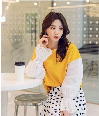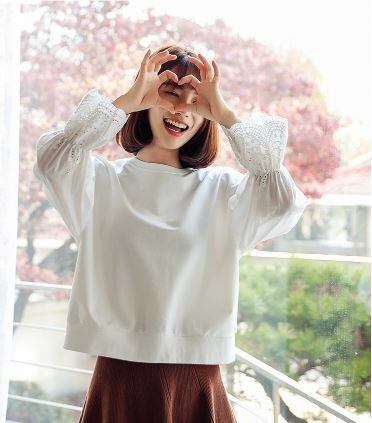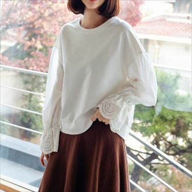 シンプルなデザインに袖シャーリング&レース使いがかわいい長袖トップスです。