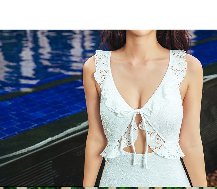 ホワイトのレース生地にフリル&編み上げデザインがフェミニンさあふれるオールインワン水着です。
