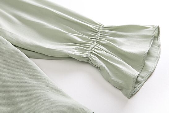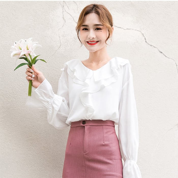 デコルテが綺麗に見える胸元には、エレガントなフリルを施し、顔周りを華やかにしてくれます。