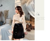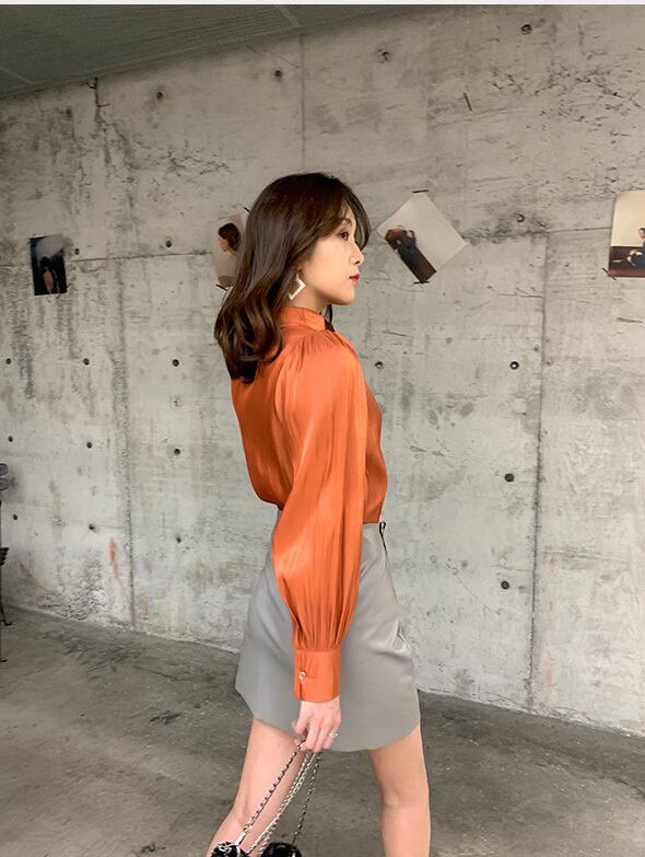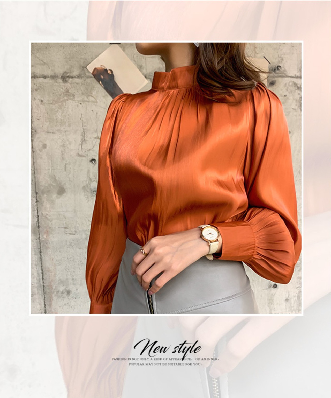 落ち着いた艶のある生地とバルーンスリーブが上品で大人っぽい印象を与えてくれるブラウス。