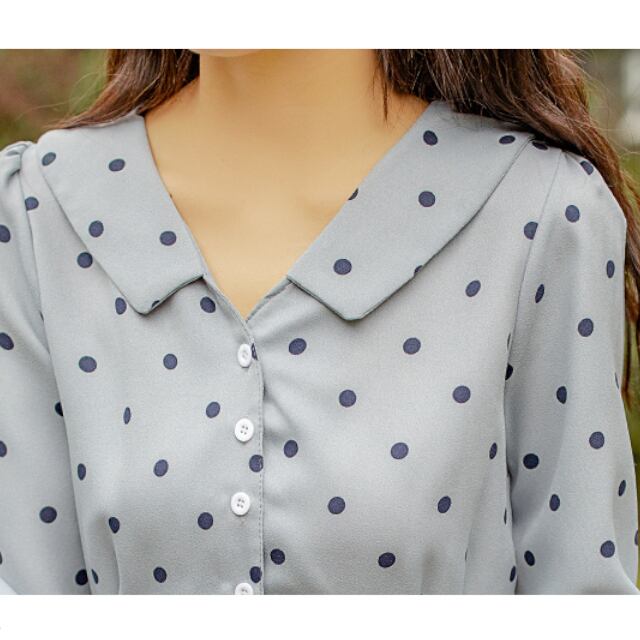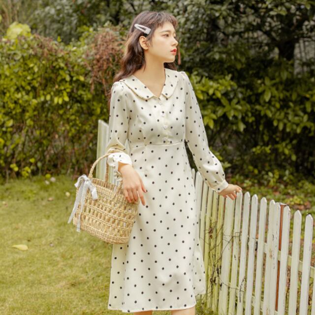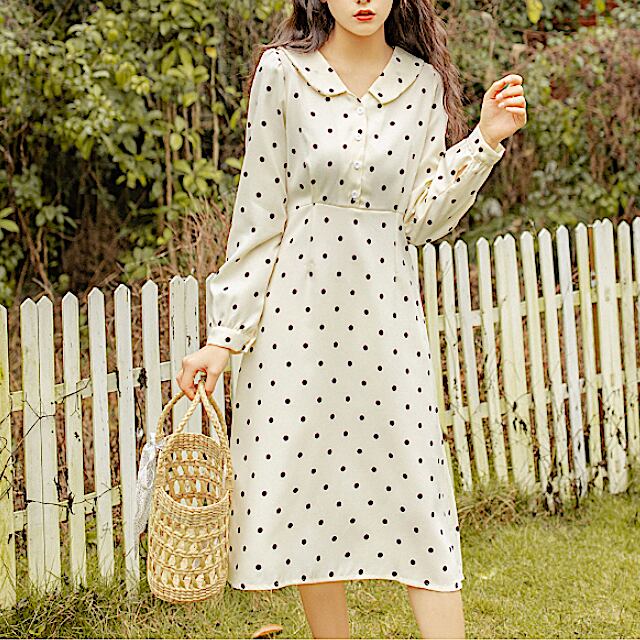 大きすぎないドット柄とさりげない襟が清楚でガーリーな印象をプラス&ハイウエストなのでスタイルアップ効果も期待できます♪