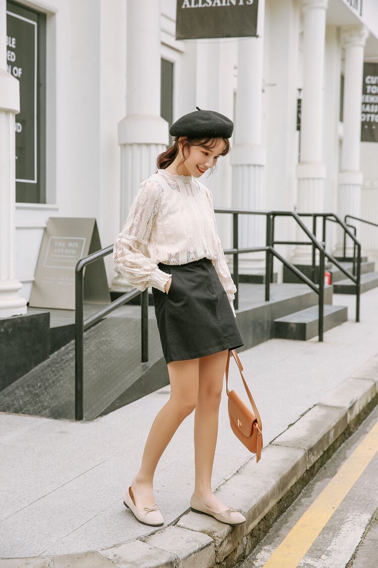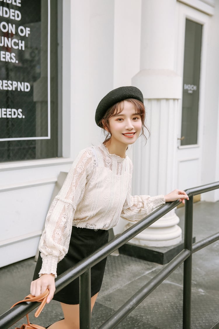 縦のラインを強調したレースパターンとスタンドネックが少し大人レディな印象をプラスし、お顔周りを華やかに見せてくれます。