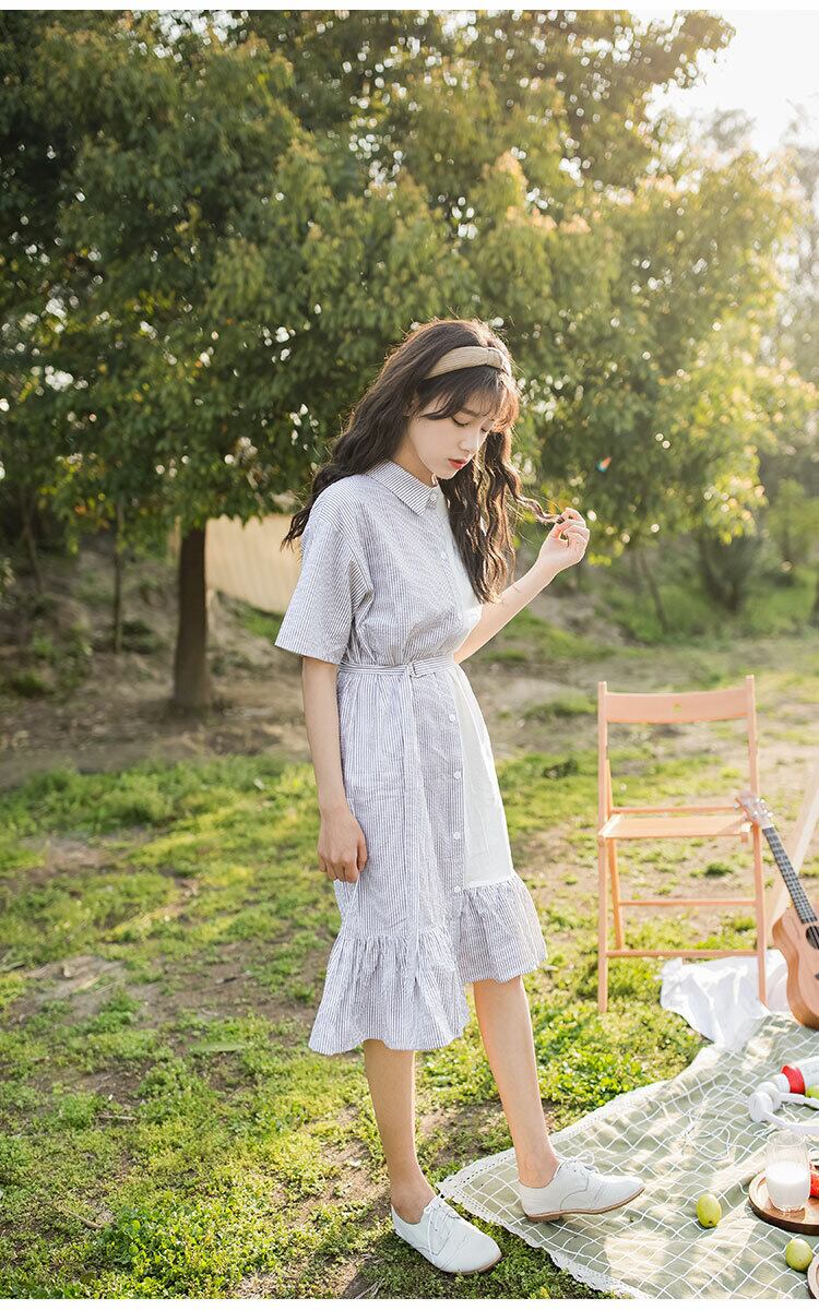 ストライプシャツ+Tシャツを合体させたアシンメトリーデザインのワンピースの登場です。よく見ると襟も丸首と襟付きでディティールにこだわった作りになっています。