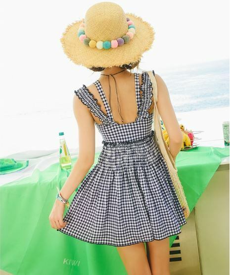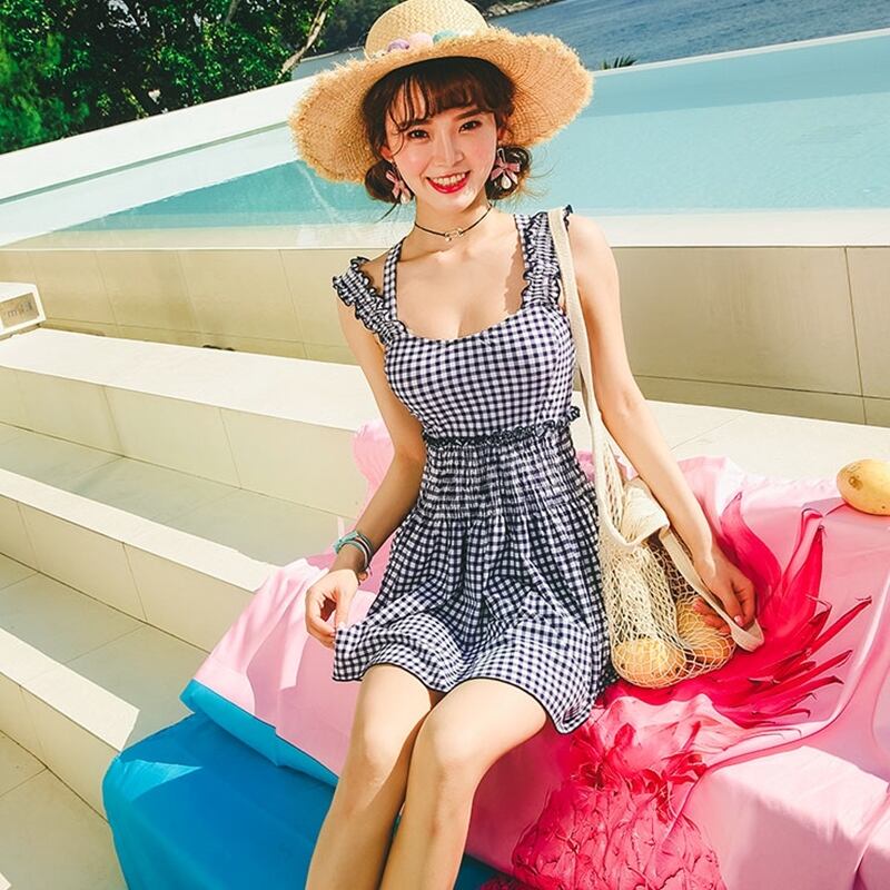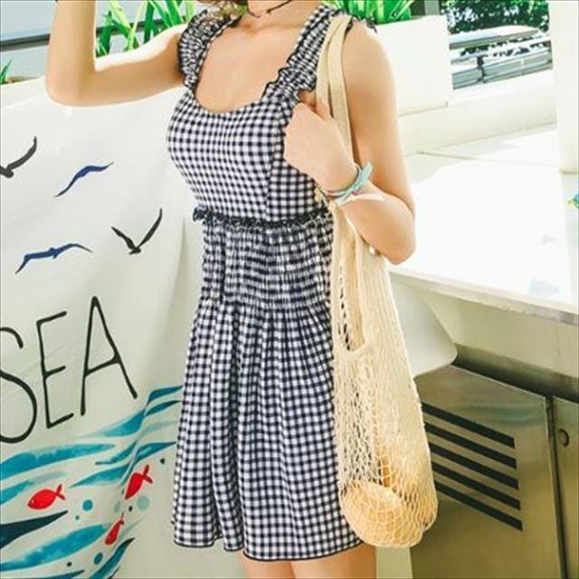 トレンドのギンガムチェックがフェミニンなワンピース水着です。