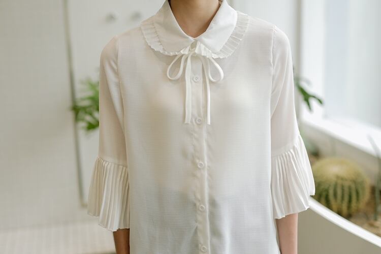 襟とお袖にあしらったプリーツデザインが、品の良さをアピールするブラウス☆