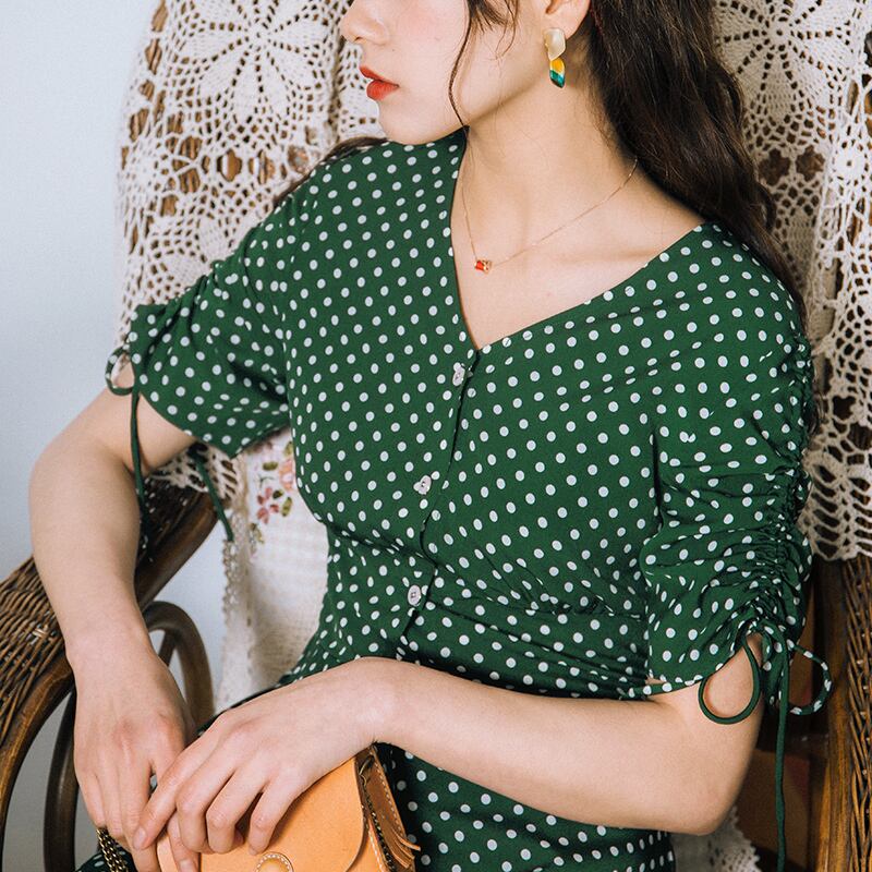 レトロなムードを醸し出す、グリーンベースのドット柄ワンピース♪