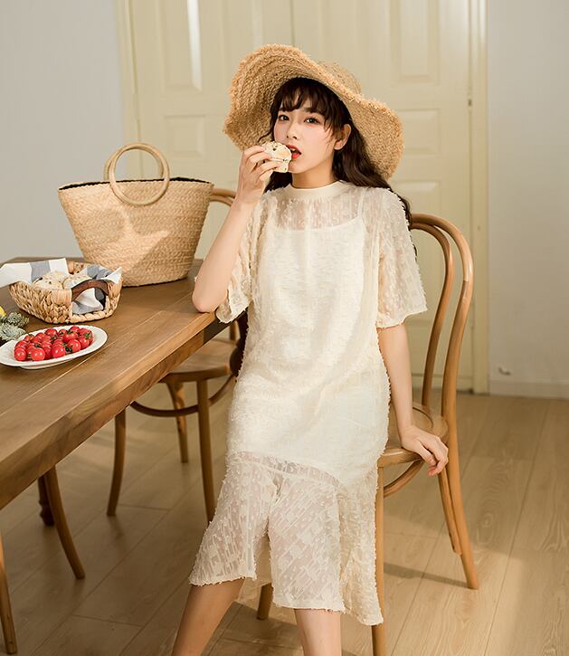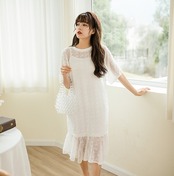 レース素材のシースルーが涼しげで女性らしい雰囲気の、膝丈ワンピースです。