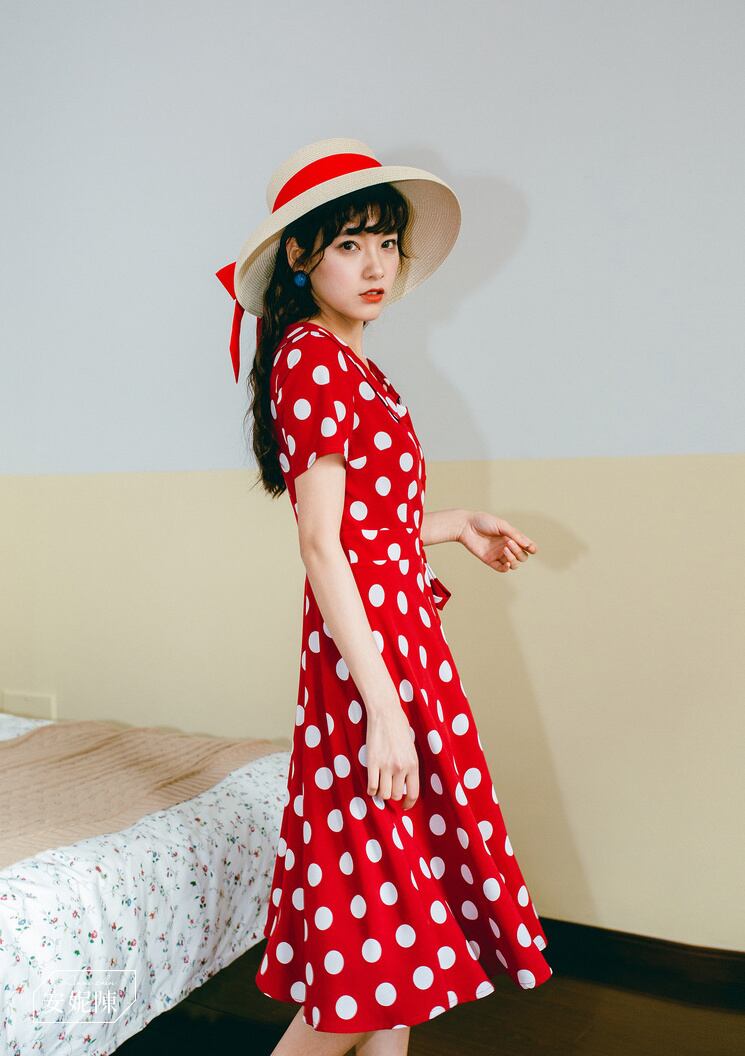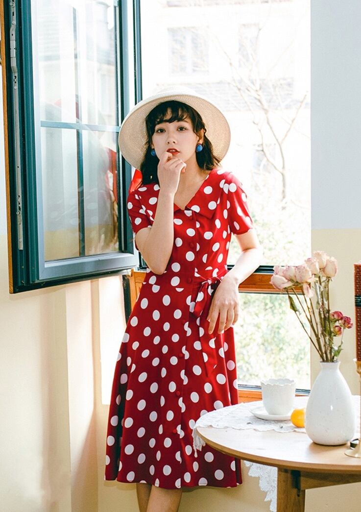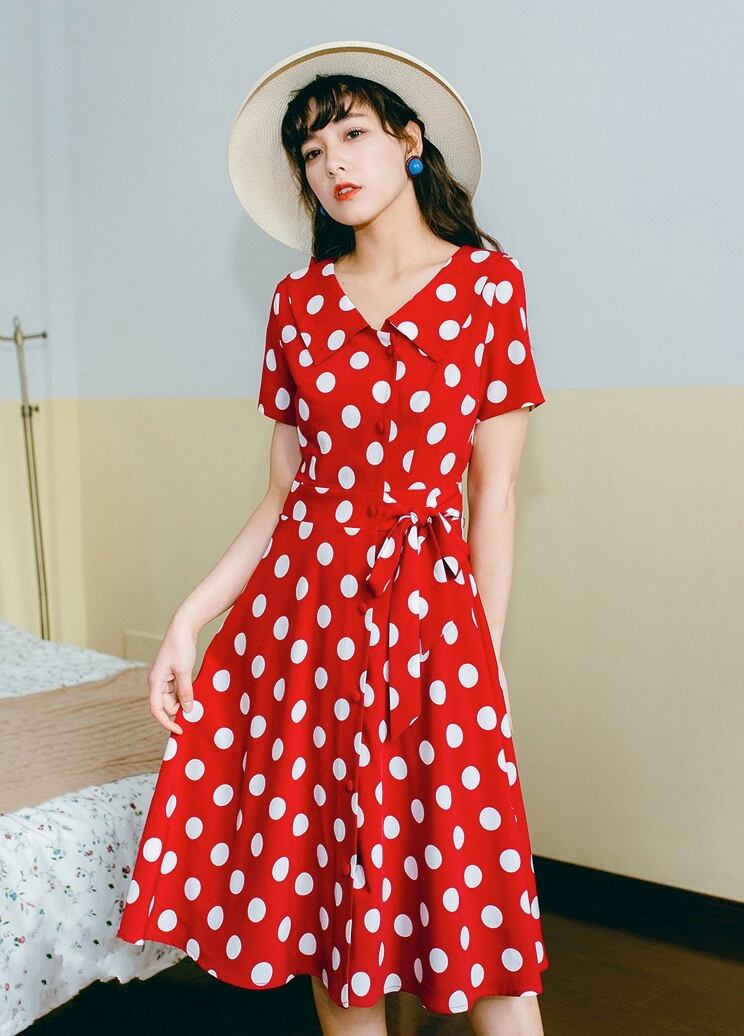 明るいレッドと大きな水玉が、元気で爽やかな印象の膝丈フレアワンピースです。