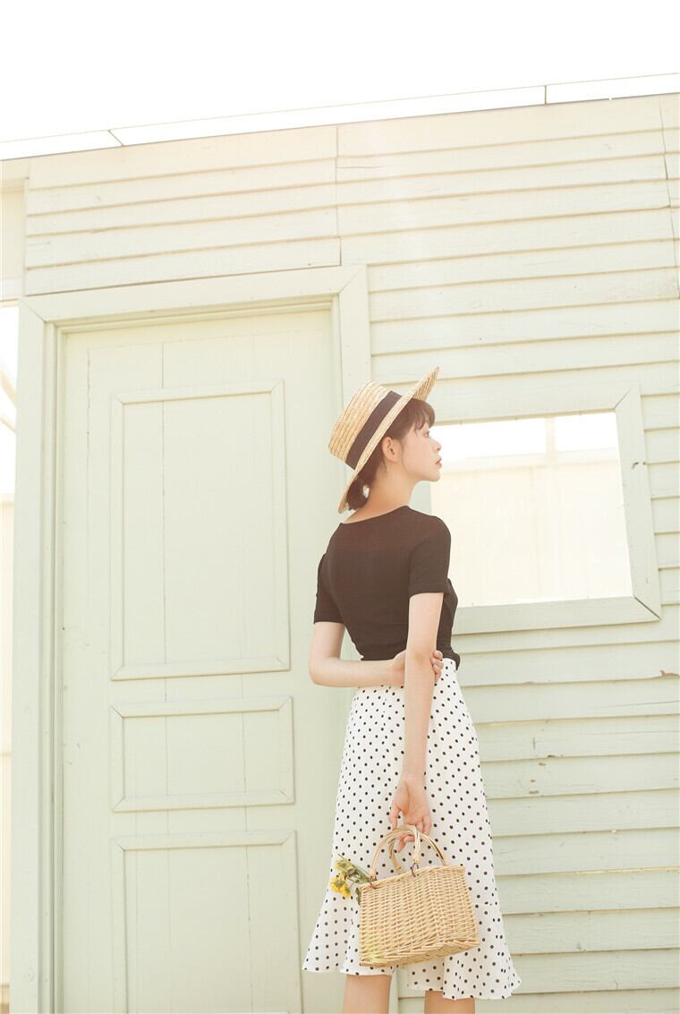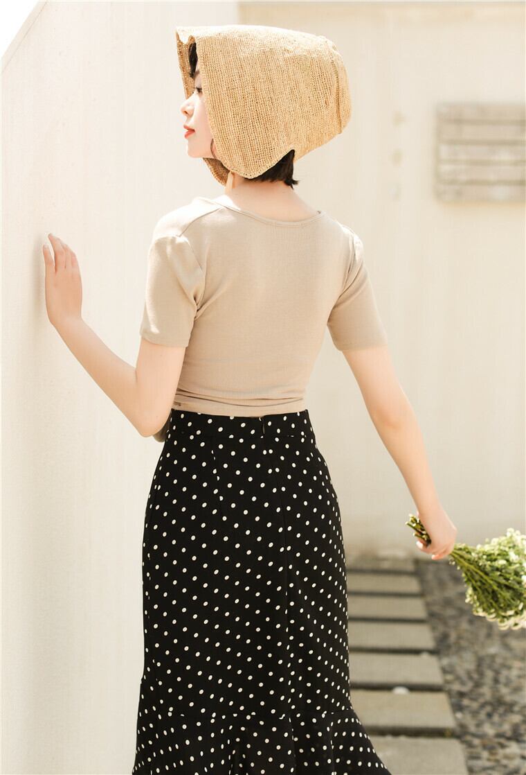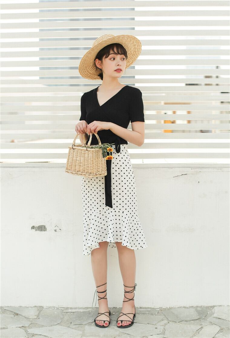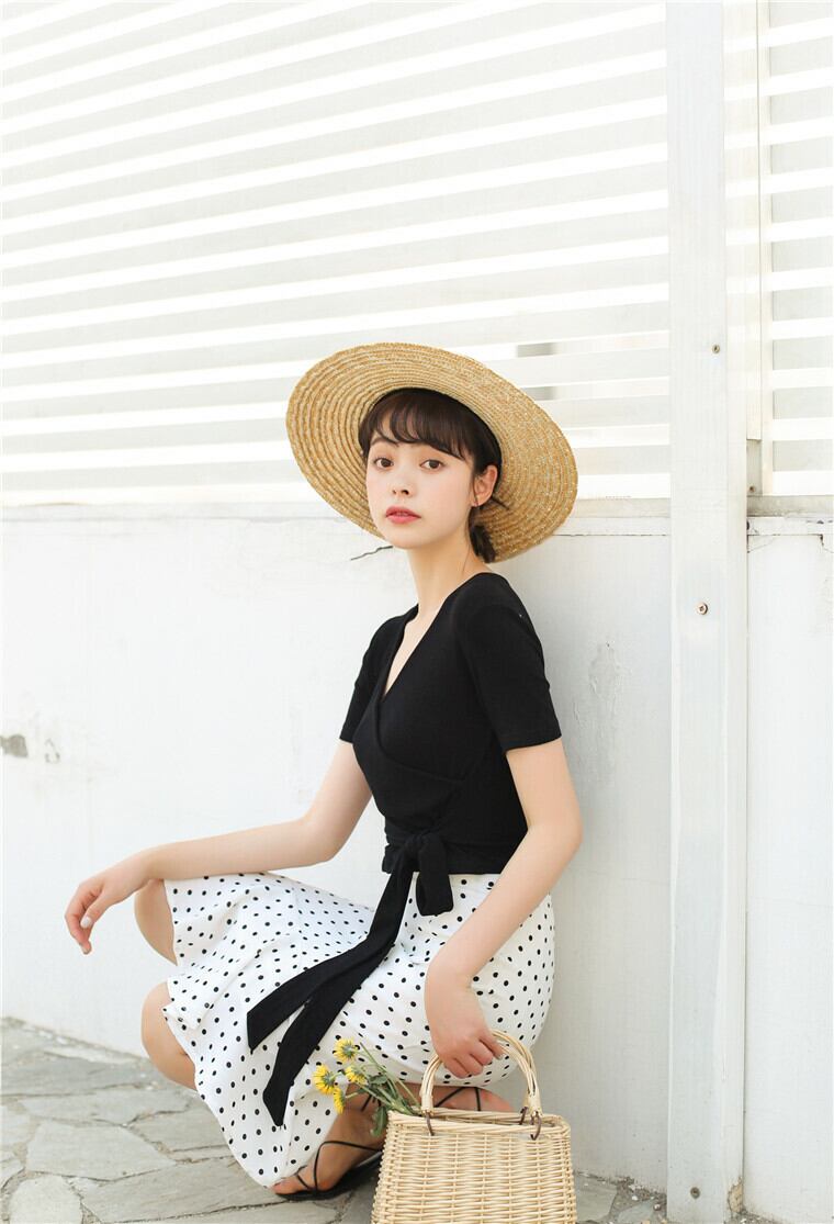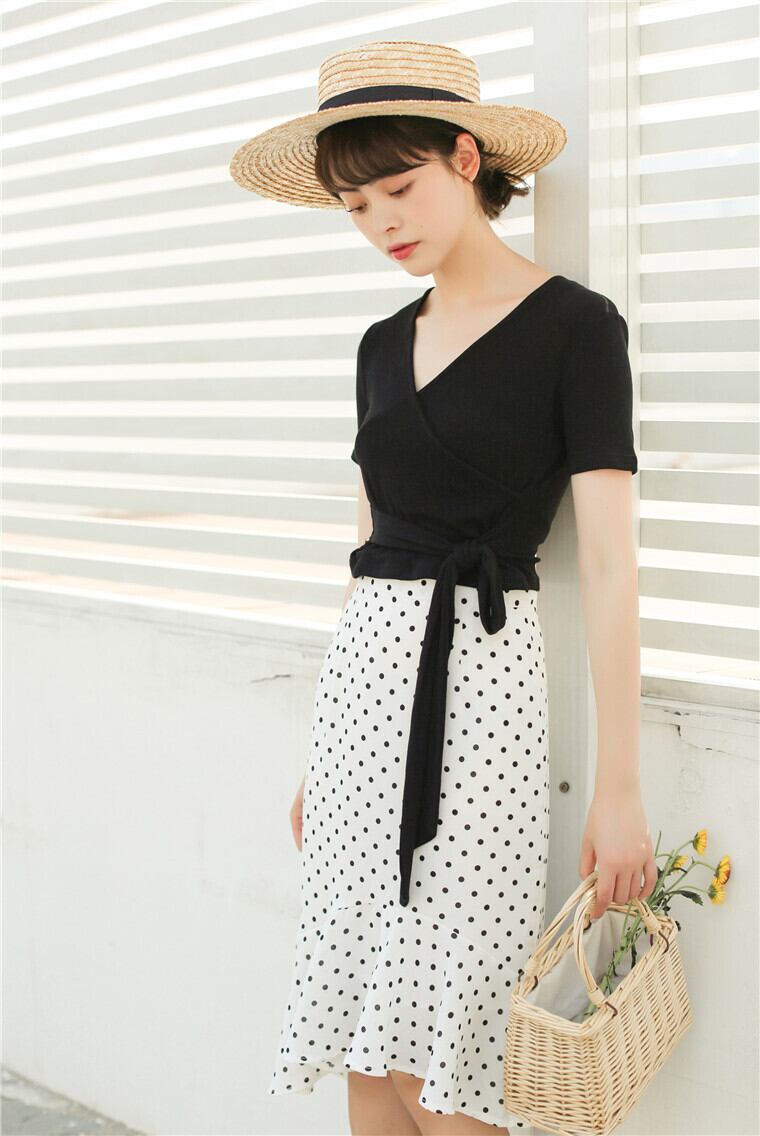 ほど良く体にフィットする生地感とウエスト部分にあしらわれたリボンがスタイルをよく見せてくれる効果あり!