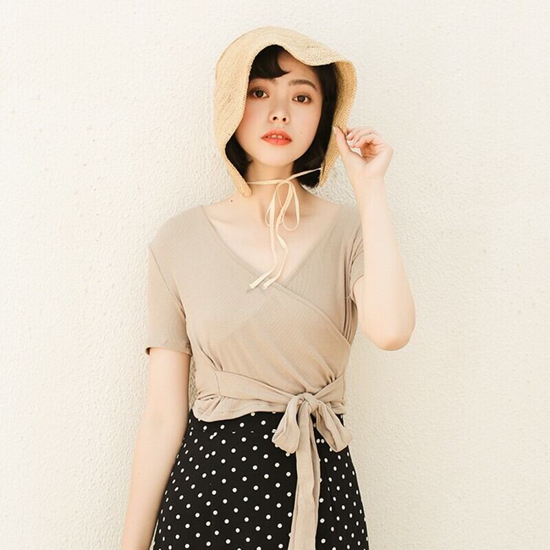 デコルテラインが綺麗に見えるカシュクールデザインが大人セクシーなTシャツです。
