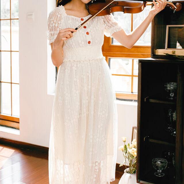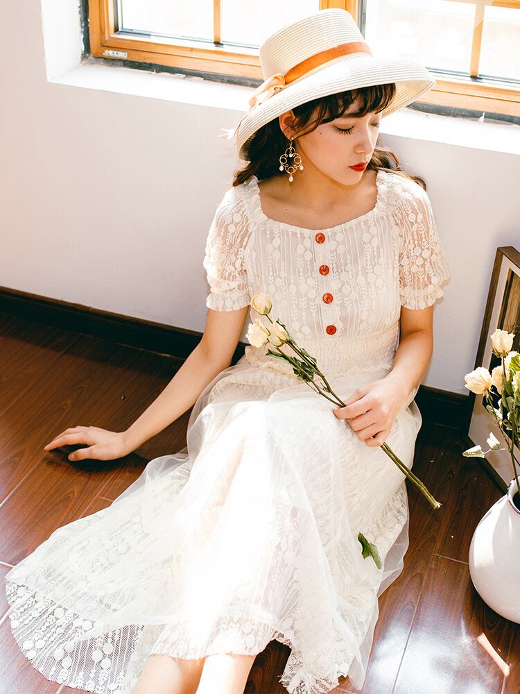 胸元をきれいに見せてくれるスクエアカラーとボタンがより一層チャーミングでフェミニンな印象に♪